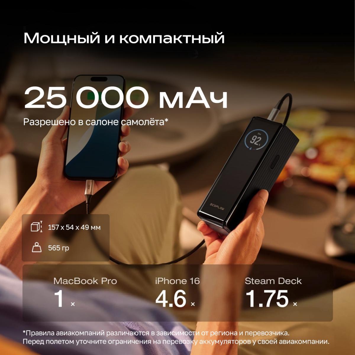 - Емкость 25 000 мАч, разрешено на борту самолета* полностью заряжает МасВоок с 0 до 100%. Заряжает смартфон 4-5 раз