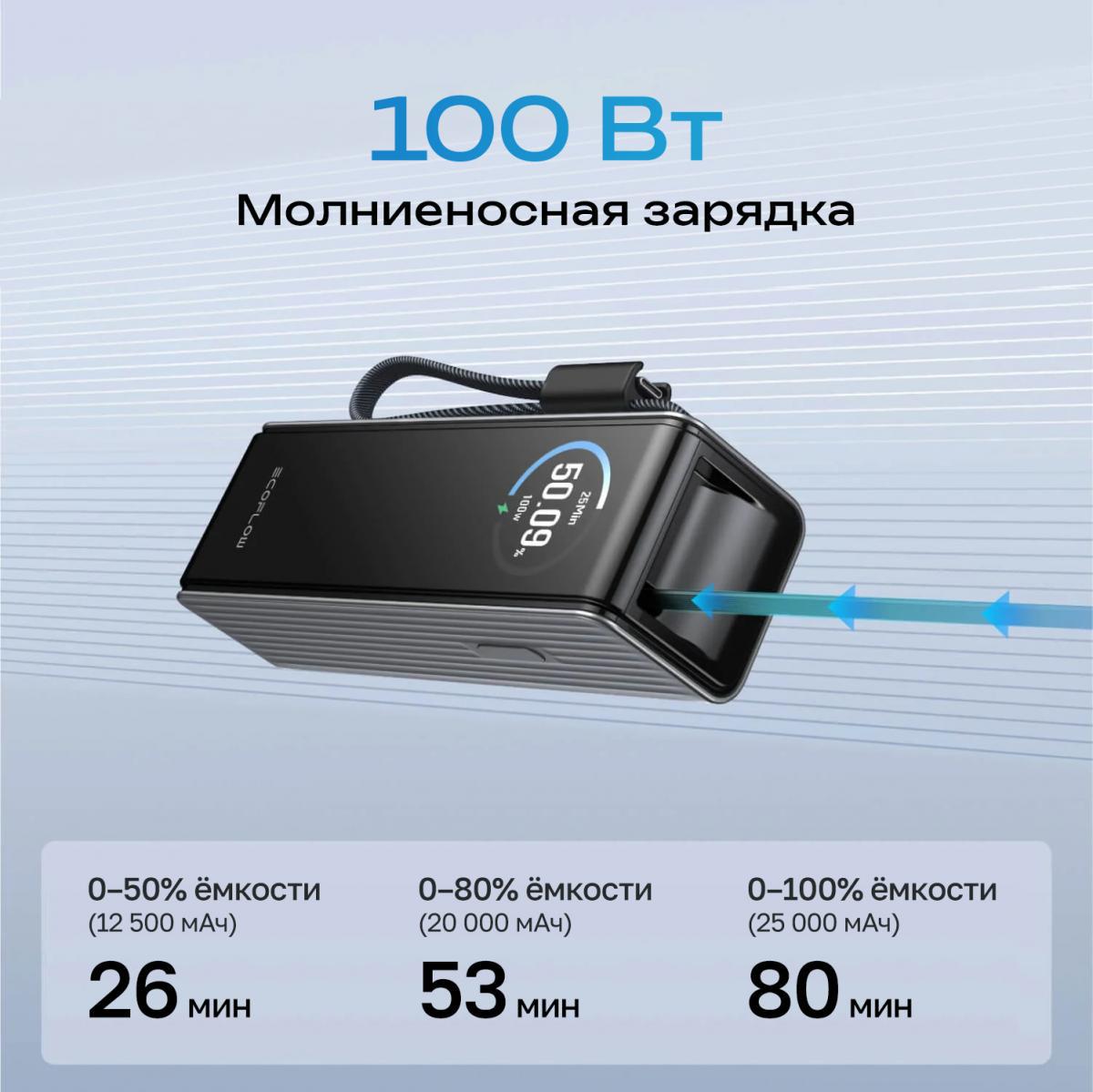 - Входная мощность до 100 Вт повербанк можно зарядить на 50% всего за 26 минут