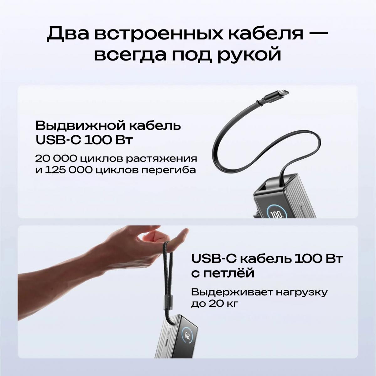 - Повербанк для нескольких устройств 2 порта USB-C, встроенный USB-C кабель (67 см), съемный USB-C кабель с петлей (26 см)