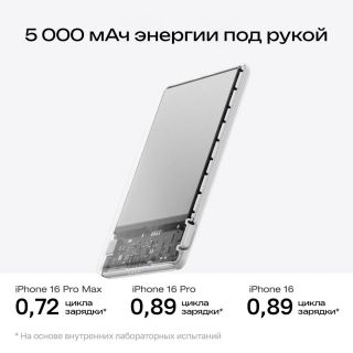 • 5 000 мАч всегда под рукой iPhone 16 заряжает на 50% всего за 36 минут