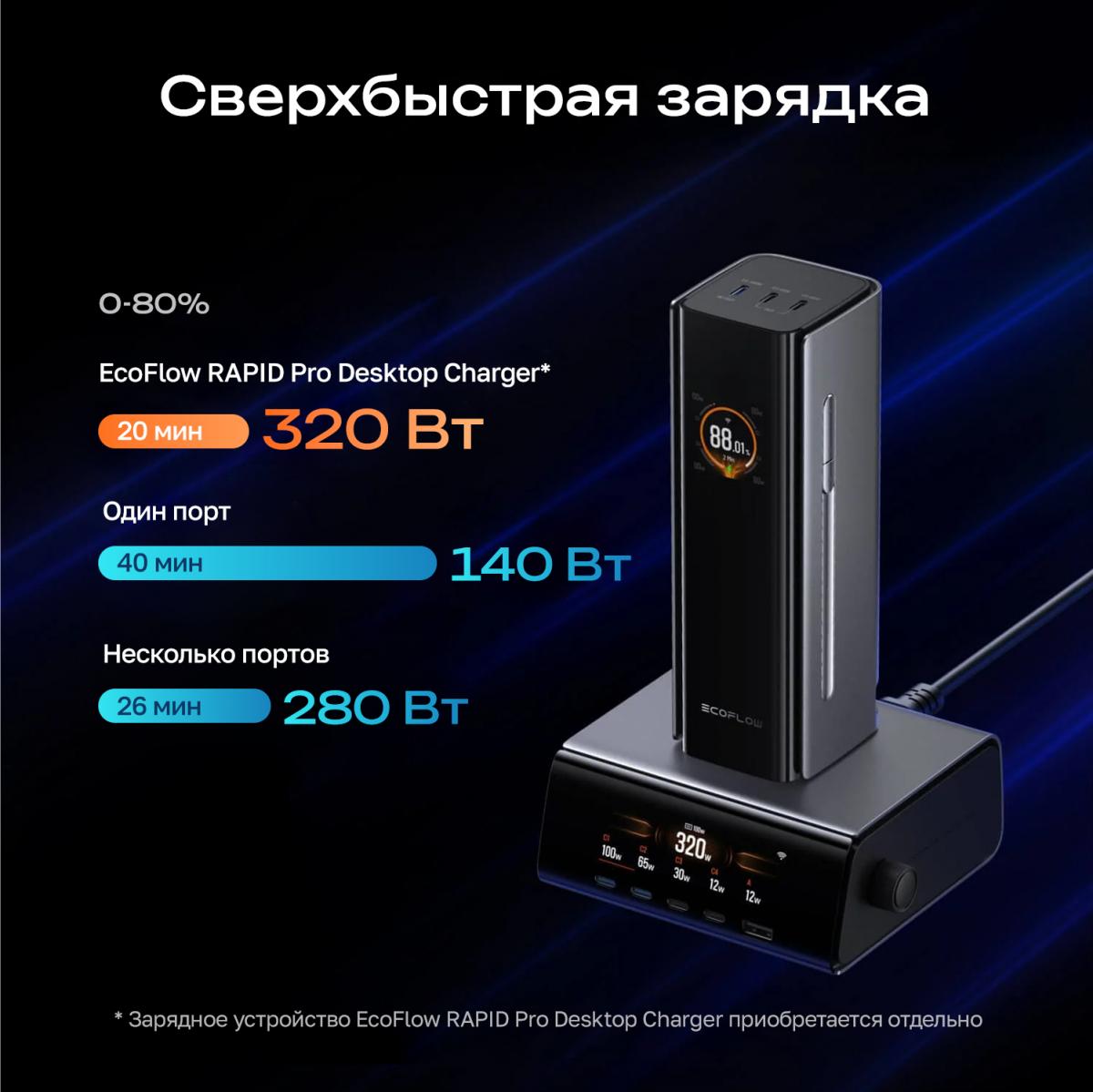 - Быстрая зарядка всего 20 минут до 80% с зарядной станцией EcoFlow RAPID Pro 320 Вт